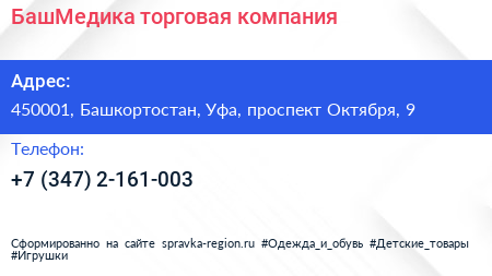 БашМедика, торговая компания по адресу 450001, Башкортостан, Уфа, проспект Октября, 9 в дальнейшем Организация, размещена в следующих категориях: