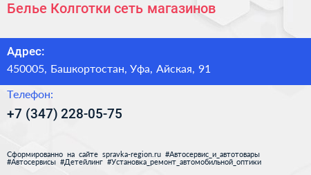 Белье & Колготки, сеть магазинов по адресу 450005, Башкортостан, Уфа, Айская, 91 в дальнейшем Организация, размещена в следующих категориях: