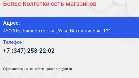 Белье & Колготки, сеть магазинов по адресу 450005, Башкортостан, Уфа, Ветошникова, 131 в дальнейшем Организация, размещена в следующих категориях: