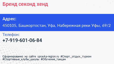 Бренд, секонд -хенд по адресу 450105, Башкортостан, Уфа, Набережная реки Уфы, 69/2 в дальнейшем Организация, размещена в следующих категориях: