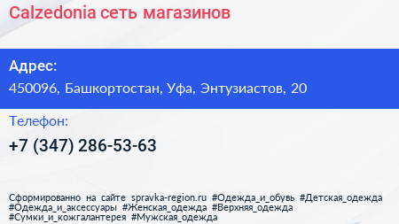 Calzedonia, сеть магазинов по адресу 450096, Башкортостан, Уфа, Энтузиастов, 20 в дальнейшем Организация, размещена в следующих категориях: