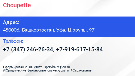 Choupette по адресу 450006, Башкортостан, Уфа, Цюрупы, 97 в дальнейшем Организация, размещена в следующих категориях: