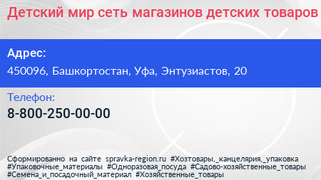 Детский мир, сеть магазинов детских товаров по адресу 450096, Башкортостан, Уфа, Энтузиастов, 20 в дальнейшем Организация, размещена в следующих категориях: