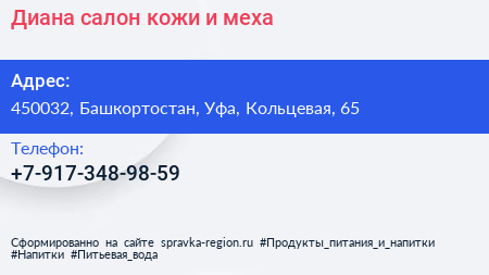 Диана, салон кожи и меха по адресу 450032, Башкортостан, Уфа, Кольцевая, 65 в дальнейшем Организация, размещена в следующих категориях: