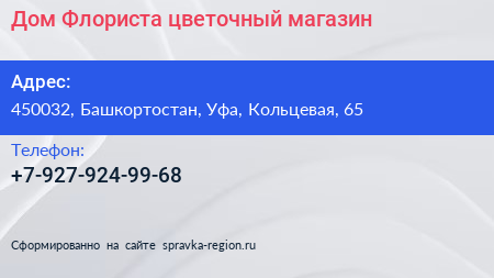 Дом Флориста, цветочный магазин по адресу 450032, Башкортостан, Уфа, Кольцевая, 65 в дальнейшем Организация, размещена в следующих категориях: