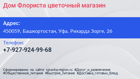 Дом Флориста, цветочный магазин по адресу 450059, Башкортостан, Уфа, Рихарда Зорге, 26 в дальнейшем Организация, размещена в следующих категориях: