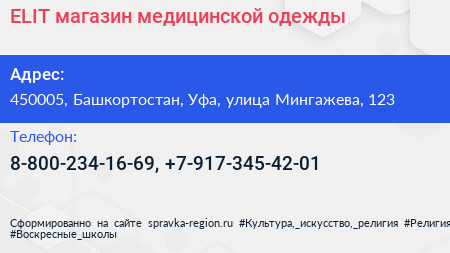 ELIT, магазин медицинской одежды по адресу 450005, Башкортостан, Уфа, улица Мингажева, 123 в дальнейшем Организация, размещена в следующих категориях: