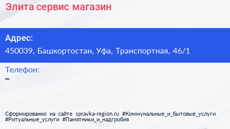 Элита-сервис, магазин по адресу 450039, Башкортостан, Уфа, Транспортная, 46/1 в дальнейшем Организация, размещена в следующих категориях: