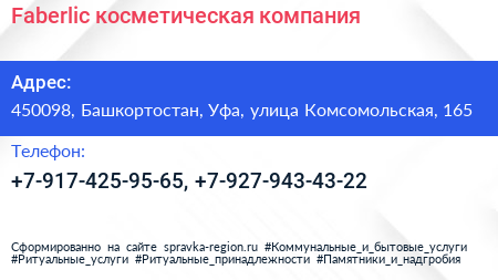 Faberlic, косметическая компания по адресу 450098, Башкортостан, Уфа, улица Комсомольская, 165 в дальнейшем Организация, размещена в следующих категориях: