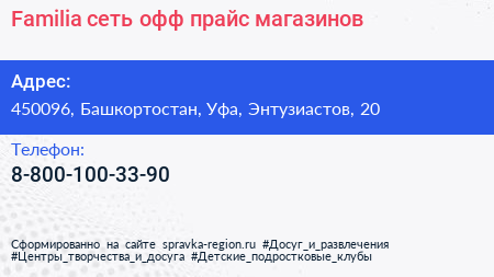 Familia, сеть офф-прайс магазинов по адресу 450096, Башкортостан, Уфа, Энтузиастов, 20 в дальнейшем Организация, размещена в следующих категориях:
