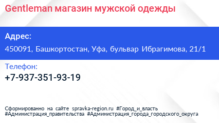 Gentleman, магазин мужской одежды по адресу 450091, Башкортостан, Уфа, бульвар Ибрагимова, 21/1 в дальнейшем Организация, размещена в следующих категориях: