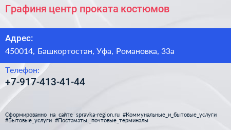 Графиня, центр проката костюмов по адресу 450014, Башкортостан, Уфа, Романовка, 33а в дальнейшем Организация, размещена в следующих категориях: