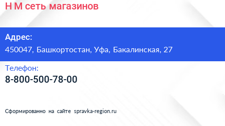 H & M, сеть магазинов по адресу 450047, Башкортостан, Уфа, Бакалинская, 27 в дальнейшем Организация, размещена в следующих категориях: