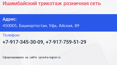 Ишимбайский трикотаж, розничная сеть по адресу 450005, Башкортостан, Уфа, Айская, 89 в дальнейшем Организация, размещена в следующих категориях: