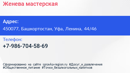 Женева, мастерская по адресу 450077, Башкортостан, Уфа, Ленина, 44/46 в дальнейшем Организация, размещена в следующих категориях: