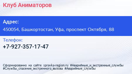 Клуб Аниматоров по адресу 450054, Башкортостан, Уфа, проспект Октября, 88 в дальнейшем Организация, размещена в следующих категориях: