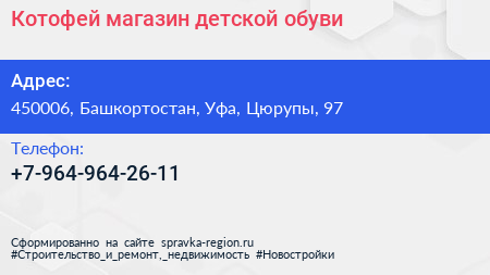 Котофей, магазин детской обуви по адресу 450006, Башкортостан, Уфа, Цюрупы, 97 в дальнейшем Организация, размещена в следующих категориях: