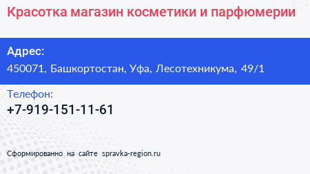 Красотка, магазин косметики и парфюмерии по адресу 450071, Башкортостан, Уфа, Лесотехникума, 49/1 в дальнейшем Организация, размещена в следующих категориях: