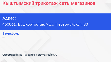 Кыштымский трикотаж, сеть магазинов по адресу 450061, Башкортостан, Уфа, Первомайская, 80 в дальнейшем Организация, размещена в следующих категориях: