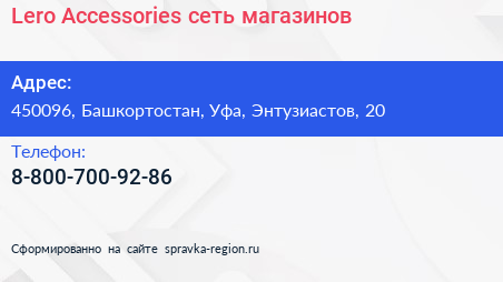 Lero Accessories, сеть магазинов по адресу 450096, Башкортостан, Уфа, Энтузиастов, 20 в дальнейшем Организация, размещена в следующих категориях:
