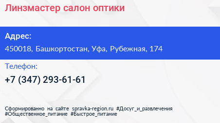 Линзмастер, салон оптики по адресу 450018, Башкортостан, Уфа, Рубежная, 174 в дальнейшем Организация, размещена в следующих категориях: