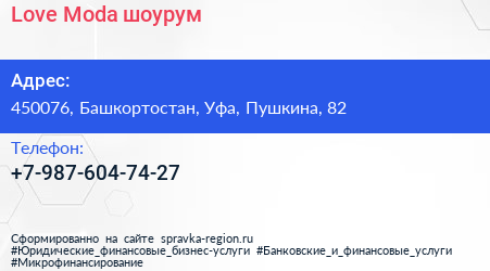 Love Moda, шоурум по адресу 450076, Башкортостан, Уфа, Пушкина, 82 в дальнейшем Организация, размещена в следующих категориях: