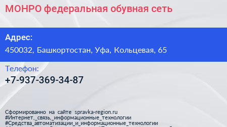 МОНРО, федеральная обувная сеть по адресу 450032, Башкортостан, Уфа, Кольцевая, 65 в дальнейшем Организация, размещена в следующих категориях: