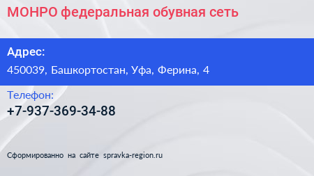 МОНРО, федеральная обувная сеть по адресу 450039, Башкортостан, Уфа, Ферина, 4 в дальнейшем Организация, размещена в следующих категориях: