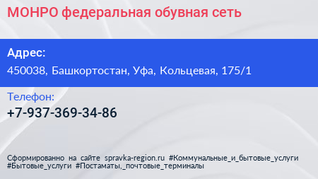 МОНРО, федеральная обувная сеть по адресу 450038, Башкортостан, Уфа, Кольцевая, 175/1 в дальнейшем Организация, размещена в следующих категориях: