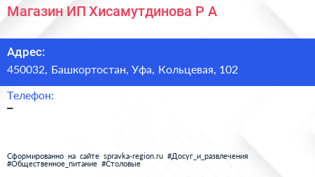 Магазин, ИП Хисамутдинова Р.А. по адресу 450032, Башкортостан, Уфа, Кольцевая, 102 в дальнейшем Организация, размещена в следующих категориях: