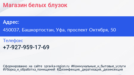 Магазин белых блузок по адресу 450037, Башкортостан, Уфа, проспект Октября, 50 в дальнейшем Организация, размещена в следующих категориях: