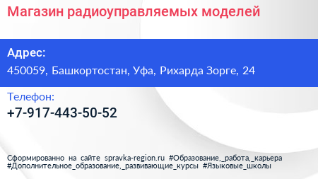 Магазин радиоуправляемых моделей по адресу 450059, Башкортостан, Уфа, Рихарда Зорге, 24 в дальнейшем Организация, размещена в следующих категориях: