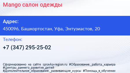 Mango, салон одежды по адресу 450096, Башкортостан, Уфа, Энтузиастов, 20 в дальнейшем Организация, размещена в следующих категориях:
