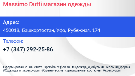 Massimo Dutti, магазин одежды по адресу 450018, Башкортостан, Уфа, Рубежная, 174 в дальнейшем Организация, размещена в следующих категориях: