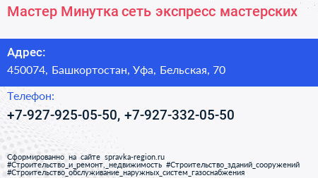 Мастер Минутка, сеть экспресс-мастерских по адресу 450074, Башкортостан, Уфа, Бельская, 70 в дальнейшем Организация, размещена в следующих категориях:
