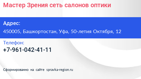 Мастер Зрения, сеть салонов оптики по адресу 450005, Башкортостан, Уфа, 50-летия Октября, 12 в дальнейшем Организация, размещена в следующих категориях: