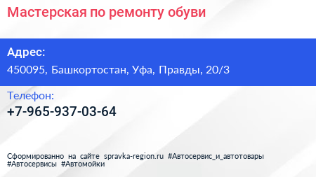 Мастерская по ремонту обуви по адресу 450095, Башкортостан, Уфа, Правды, 20/3 в дальнейшем Организация, размещена в следующих категориях: