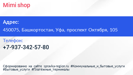 Mimi shop по адресу 450075, Башкортостан, Уфа, проспект Октября, 105 в дальнейшем Организация, размещена в следующих категориях: