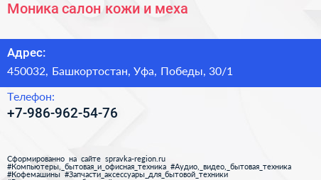 Моника, салон кожи и меха по адресу 450032, Башкортостан, Уфа, Победы, 30/1 в дальнейшем Организация, размещена в следующих категориях: