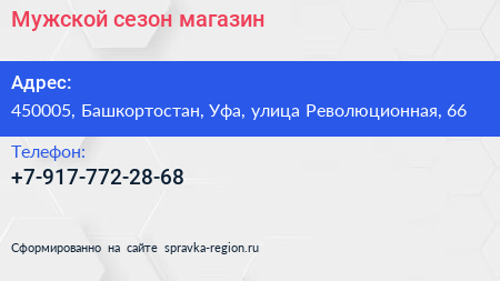 Мужской сезон, магазин по адресу 450005, Башкортостан, Уфа, улица Революционная, 66 в дальнейшем Организация, размещена в следующих категориях: