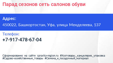 Парад сезонов, сеть салонов обуви по адресу 450022, Башкортостан, Уфа, улица Менделеева, 137 в дальнейшем Организация, размещена в следующих категориях:
