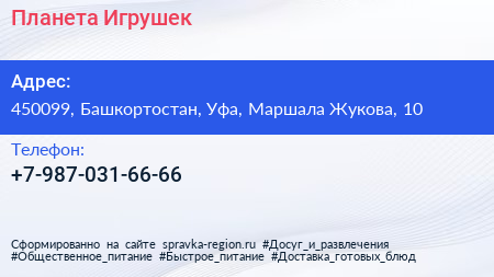 Планета Игрушек по адресу 450099, Башкортостан, Уфа, Маршала Жукова, 10 в дальнейшем Организация, размещена в следующих категориях: