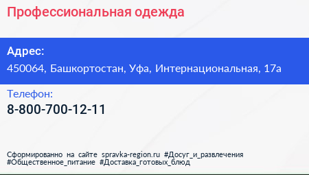 Профессиональная одежда по адресу 450064, Башкортостан, Уфа, Интернациональная, 17а в дальнейшем Организация, размещена в следующих категориях: