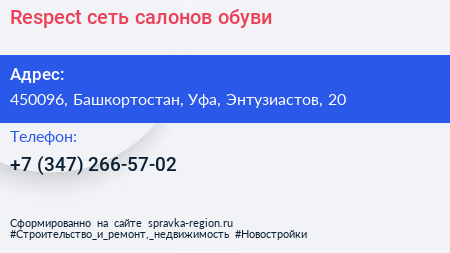 Respect, сеть салонов обуви по адресу 450096, Башкортостан, Уфа, Энтузиастов, 20 в дальнейшем Организация, размещена в следующих категориях: