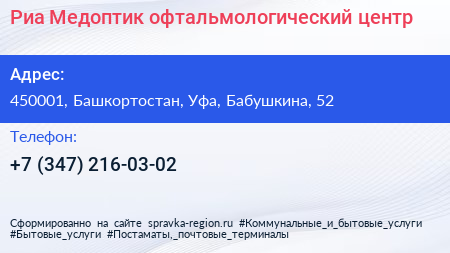Риа-Медоптик, офтальмологический центр по адресу 450001, Башкортостан, Уфа, Бабушкина, 52 в дальнейшем Организация, размещена в следующих категориях:
