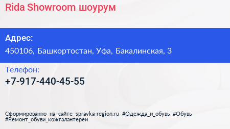 Rida Showroom, шоурум по адресу 450106, Башкортостан, Уфа, Бакалинская, 3 в дальнейшем Организация, размещена в следующих категориях: