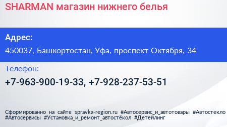 SHARMAN, магазин нижнего белья по адресу 450037, Башкортостан, Уфа, проспект Октября, 34 в дальнейшем Организация, размещена в следующих категориях: