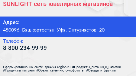SUNLIGHT, сеть ювелирных магазинов по адресу 450096, Башкортостан, Уфа, Энтузиастов, 20 в дальнейшем Организация, размещена в следующих категориях: