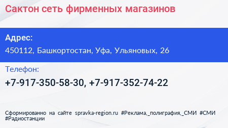 Сактон, сеть фирменных магазинов по адресу 450112, Башкортостан, Уфа, Ульяновых, 26 в дальнейшем Организация, размещена в следующих категориях: