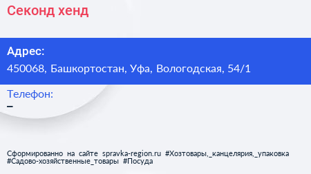 Секонд-хенд по адресу 450068, Башкортостан, Уфа, Вологодская, 54/1 в дальнейшем Организация, размещена в следующих категориях: